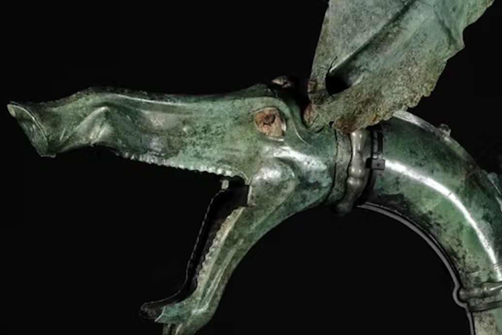 Détail d'un des carnyx retrouvés en pièces en 2004 sur le site de Tintignac (Corrèze). Il représente une tête de sanglier stylisée. En 2012, une équipe d’acousticiens a analysé et réussi à reproduire la sonorité grave du carnyx, cette trompe gauloise qui effrayait leurs ennemis.
